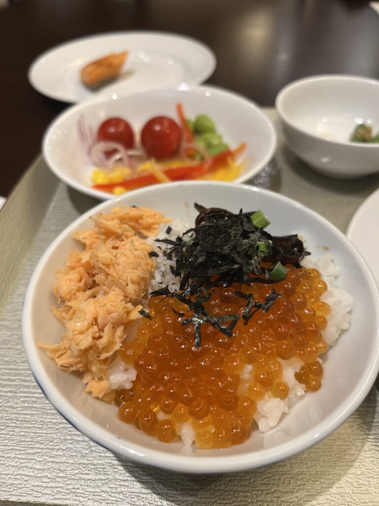 いくら・しらす・鮭の海鮮丼。フレンチトーストやパンケーキ・デザートもたっぷりいただきました。