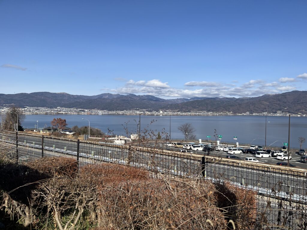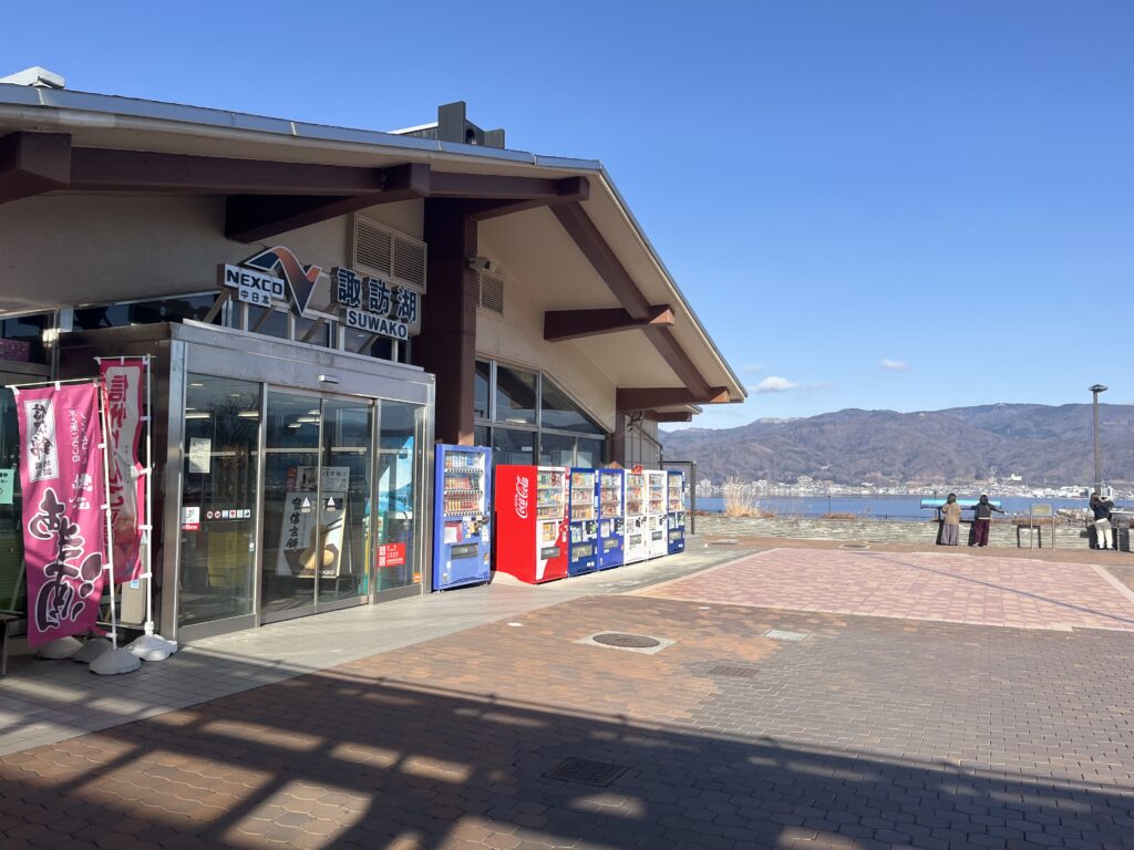 私は車で行きました。東京方面から中央道で4時間ほど。諏訪湖SAは充実しつつ 諏訪湖を眺められてとても良かったです。