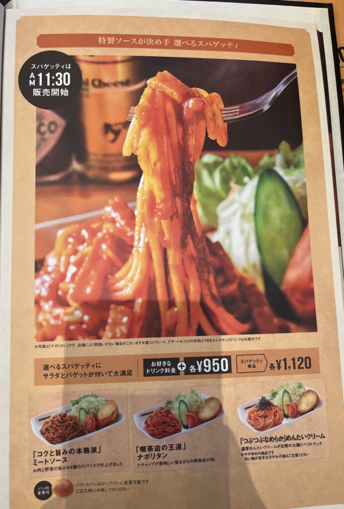 メニューを見ると、ボリューム満点のハンバーガーやスパゲッティにも惹かれます。